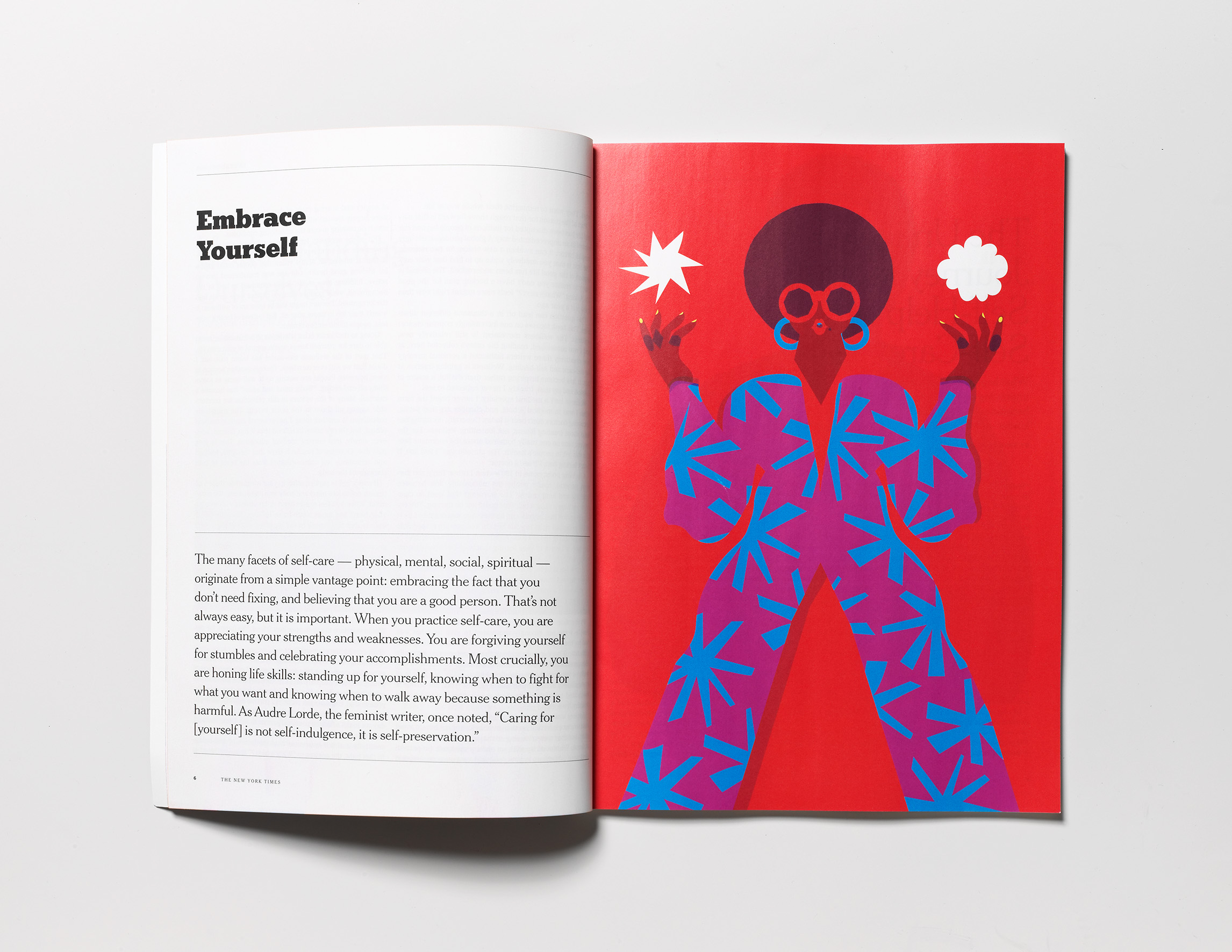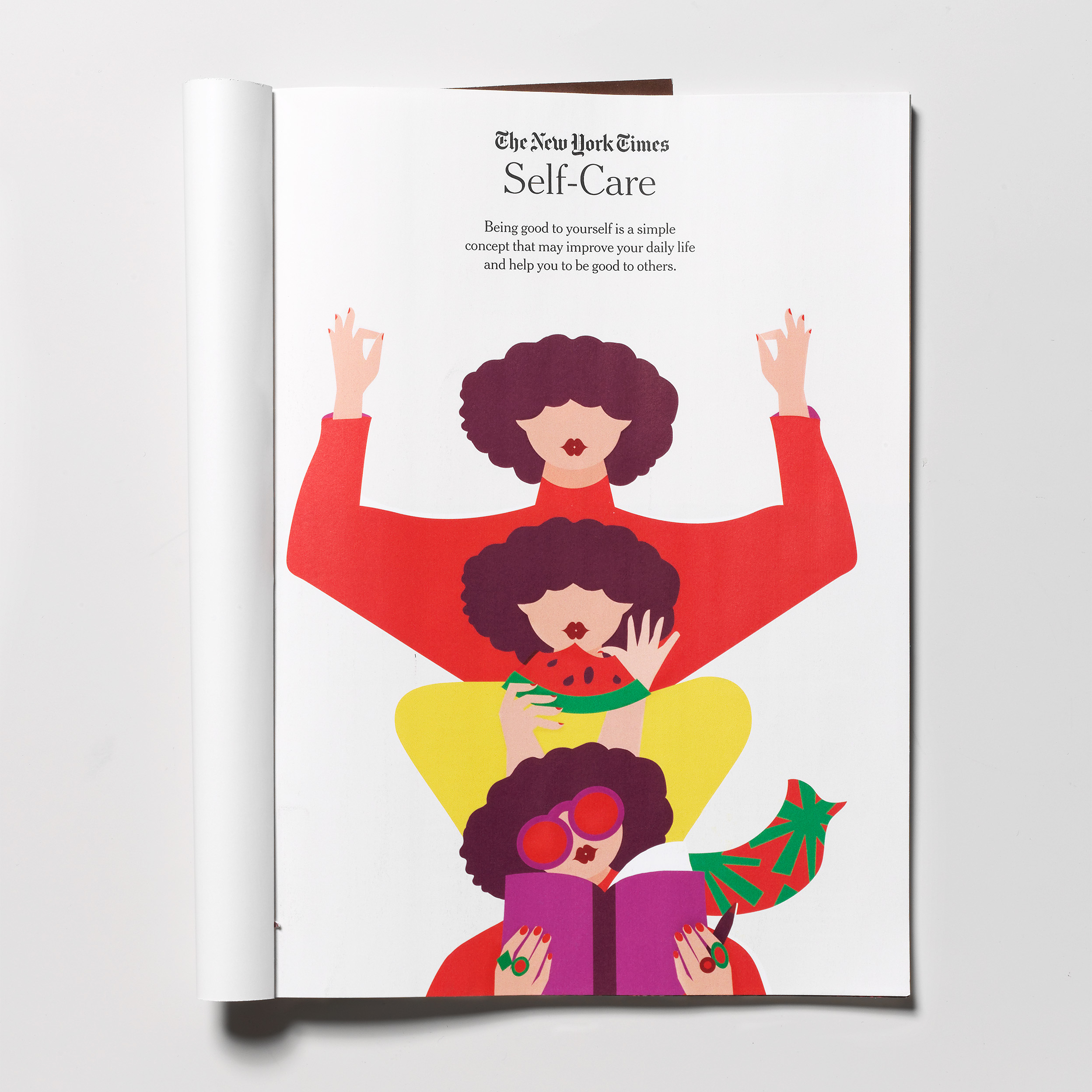 I was commissioned to illustrate a cover and a series of section openers for a special issue of a Self-Care themed magazine for Meredith x The New York Times. This cover proposal was used as an internal cover. The three section illustrations correspond to the following themes -